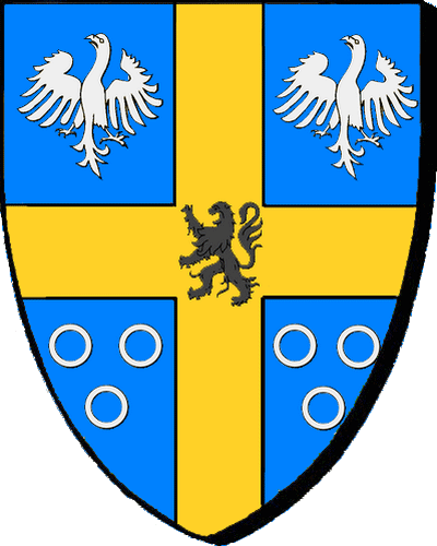 Armoiries; blason / Ardamezioù; skoed : * Éditions Flohic : "le lion symbolise le pays de Léon. Les aigles viennent des armes des Mesnoalet, les six annelets de celles des Keroual, ... et les lévriers de celles des Coat-Ty-Bescond, dont la devise est "Passe hardiment". * Froger et Pressensé : "d'azur à la croix d'or chargée en cur d'un lion morné de sable et cantonnée en chef de deux aiglettes et en pointe de six annelets, le tout d'argent". Devise : "Persévérance et hardiesse". Concepteurs : MMrs Fagnen et Shultz. D.M.: 22 octobre 1987. * Daniel Delattre (2004) : "de gueules à la fasce d'or accompagnée de six besants du même, trois en chef, trois en pointe"- Ce blasonnement ne correspond pas du tout au blason retenu par la ville de Guilers. Erreur ou confusion ? * JC Even : "en glazur e groaz en aour karget ouzh kondon gant ul leon kudennek en sabel, hag heuliet ouzh kab gant daou ererig en arc'hant, unan ouzh pep konk, hag ouzh beg gant c'hwec'h ruilhenn en arc'hant, tri ouzh pep konk" |