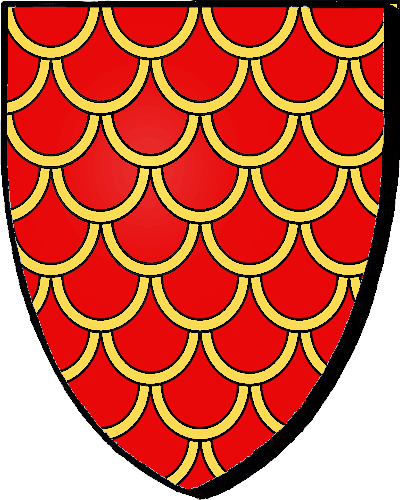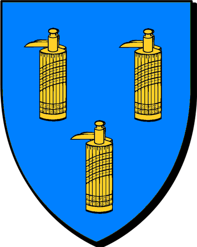 "d'azur au chevron d'or, accompagné de trois pommes de pin de même" "en glazur e gebrenn en aour, heuliet gant teir aval-pin ivez en aour" - François, président aux Grands-Jours de Bretagne en 1538, puis président à mortier au Parlement de Bretagne en 1554 - René, président à mortier au Parlement de Bretagne en 1556 - Pierre, conseiller au Parlement de Bretagne en 1565 - René, (le même ?) président à mortier au Parlement de Bretagne en 1570 Une branche fondue en 1697 dans Contades; une autre branche transplantée dans l'Orléanais, y maintenue en 1668 |