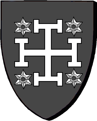 Famille de Cadoudal : seigneur dudit lieu et de Kervéno, en Plumelec; des Salles, de Kermarker, en Guern. "d'argent à la croix engreslée de sable" / "en arc'hant e groas goñchek en sabel". références et montres de 1427 à 1536. (PPC) |