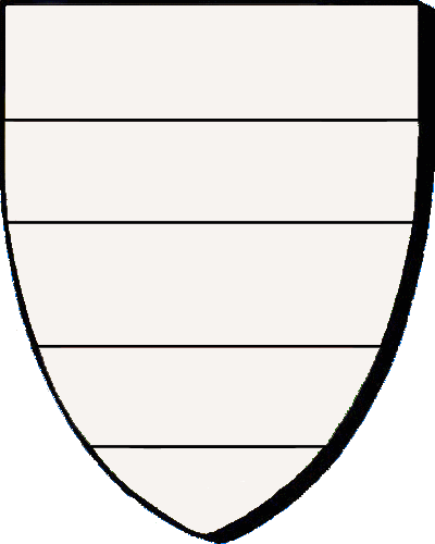 Famille de Cacé : Seigneurs dudit lieu, en l'Hermitage : "de sable à trois fasces d'argent accompagnées de trois coquilles de même" / "en sabel e deir dreustell en arc'hant heuliet gant teir kregilhenn ivez en arc'hant". (PPC) |