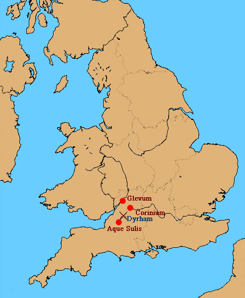 - 577 : Bataille de DEORHAM / DYRHAMM : Cuthwine et Ceawlin, rois des West-Saxons, écrasent les Britto-romains, tuent trois rois bretons : Coinmail, Aurelius Condidanus, et Farinmail, et s'emparent de trois villes importantes : une ancienne colonie romaine : Glevum / Cair Gloiou / Gloucester, la capitale de la Britannia Prima : Corinium / Cair Geri / Cirencester, et une ville d'eaux réputée Aquae Sulis / Aquae Minerva / Bath.