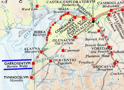 Extrait de la carte Ordnance Survey : Map of Roman Britain. Noter l'inversion d'identification Gabrosentum / Tunnocelum, entre Rivet & Smith et Ordnance Survey. |