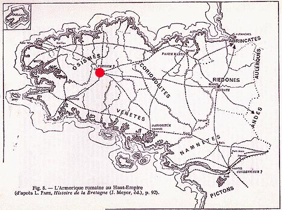 Histoire / Istor : Vorgium / Carhaix n'existait pas en tant qu'agglomération avant la conquête romaine de la Gaule. Les recherches archéologiques n'ont à peine démontré sur le site que l'existence d'un habitat disparate. L'emplacement de Vorgium est en soi une démonstration de l'efficacité et de la précision des agrimensores / arpenteurs romains : à équidistance des 3 mers qui entourent la péninsule de l'occident celtique : la Manche au nord, l'Iroise à l'ouest, l'Atlantique au sud. ***
