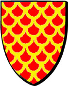: "parti en 1 d'azur à 3 fleurs de lys d'or et d'un bâton péri de gueules en bande, qui est la famille de Condé, en 2 de Bretagne, et portant sur le tout un blason de gueules semé de fleurs de lys, qui représente la famille des barons de Châteaubriant". * M. Froger & M. Pressensé : "parti : - au 1, d'azur à 3 fleurs de lys d'or, au bâton péri de gueules en abîme, posé en bande, - au 2, d'hermine plein, sur le tout, de gueules semé de fleurs de lys d'or". "Le premier est Condé, le second de Bretagne. Les Châteaubriant portaient soit de gueules semé de pommes de pin d'or, soit papelonné d'or. Après la bataille de Mansourah (1250), Louis IX autorisa Chotard de Châteaubriant à les transformer en fleurs de lys (selon Joinville)". * Ogée (voir ci-dessous) : " En 1250, ... La même année, Louis IX, pour récompenser Geoffroi de Chateaubriand des services qu'il lui avait rendus, lui donna pour armes des fleurs de lys d'or sans nombre, au lieu de pommes de pin qu'il portait auparavant"; |
