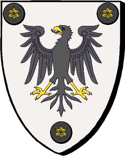 Seigneurs de la Babouinaye et de la Hamerais, en Cordemais; de Langle, en Saint-Etienne-de-Montluc; de la Gendronnière, en Orvault "d'argent à l'aigle de sable, membrée et becquée d'or, accompagnée de trois tourteaux de sable, chargés chacun d'une molette d'or" "en arc'hant e erez en sabel, iziliet ha pigoset en aour, heuliet gant teir dorzhell en sabel, pep hini karget gant ur rodig-kentr en aour" Références de 1428 à 1443, en Cordemais. |