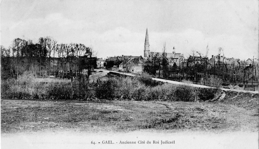 | Histoire / Istor : * Ogée (1780) : Gaël; sur la rivière de Muhel et sur la route de Ploërmel à Saint-Méen; à 12 lieues 1/2 de Saint-Malo, son évêché [aujourd'hui Rennes], à 8 lieues 1/3 de Rennes, et à 3 lieues 5/4 de Plélan, sa subdélégation. Cette paroisse a une haute-justice, qui appartient à M. de Montigny et ressortit au siège royal de Ploërmel. On y compte 3800 communiants, y compris ceux du Bran et de Muhel [Muel], ses trêves. La cure est présentée par l'abbé de Saint-Méen. En 540, les forêts de Paimpont, de Brécilien, de la Hardouinais, de Moncontour et de la Noue, formaient une seule forêt, qui s'étendait depuis Gaël jusqu'à Corlay, et partageait la Bretagne en deux parties, dont l'une se nommait le pays en deçà [Porhoët], et l'autre le pays au-delà de la forêt [Trécouët]. L'an 600, Caduon, seigneur de la majeure partie de cette forêt, donna un terrain à saint Méen, à condition qu'il aurait élevé un monastère sur la rivière de Muhel, à peu de distance de son château : ce que le saint se hâta d'exécuter. Ce monastère fut brûlé en 814. On érigea sur ses ruines une église paroissiale, qui fut donnée, l'an 1001, à Hugueton, abbé de Saint-Méen, par Alain III. fils du duc de Bretagne Geoffroy Ier. Depuis ce temps, Gaël a toujours dépendu de cette abbaye. La seigneurie de cette paroisse appartenait, en 1065, à Raoul de Gaël, qui, en 1070, passa en Angleterre avec cinq mille Bretons que lui avait donnés Alain Fergent, duc de Bretagne, pour aider Guillaume, duc de Normandie, à conquérir le royaume d'Angleterre, auquel il était appelé par le testament du roi Edward ou Edouard, mort sans enfants. Harald, qui disputait le trône au Normand, lui livra bataille et fut vaincu. Guillaume, pour récompenser Raoul de Gaël, lui donna les comtés de Norfolk et de Suffolck, dont sa postérité a joui très-long-temps. Les descendants de ce seigneur se sont toujours distingués dans les armes. Cette illustre famille subsiste encore en Bretagne, en la personne de M. le comte du Largez. ( Voy. Louargat.) L'an 1192, le pape Célestin III confirma, à l'exemple de Lucius et de Clément, ses prédécesseurs, par une bulle adressée à Rolland, abbé de Saint-Méen, son abbaye dans la possession des privilèges et des biens qui lui avaient été donnés en aumône sur l'église de Gaël. On voyait jadis un fort château, qui, après avoir soutenu plusieurs sièges, fut enfin pris, en 1373, par Bertrand Duguesclin, connétable de France. Il n'en reste aujourd'hui que les masures, avec les traces des fossés. En 1386, le fief de Pelmorvan, que le vicomte de Dinan avait acheté l'an 1180, appartenait à Raoul, sire de Montfort. La paroisse de Gaël est décorée de plusieurs manoirs et maisons nobles, qui appartenaient, en 1420, savoir : la Gallonaye, à Jean Desalles; la Ville-Boschet, à Eon Agan; le Chêne, à Jean Gouezel; la Cornillière, à Dom Jean Relle; Couetti-Buf, à Pierre Gourhaut; la Haye-Bellouan, à Jean Bellouan; la Haye, à Guillaume de la Haye; la Bouexière, à Guillaume l'Evêque; le Plessis-au-Prévost, à Jean le Prévost; l'Est-Nest, à Guillaume Quejau; le Plessis-Guelier-au-Hereu, à Alain le Prévost; la Houssaye, à Geoffroy de la Houssaye; Rosaez, à Philippe des Salles; la Ville-Raoul, à N. du Vauferrier; la Touche, à Olivier Anne; la Noë, à Gilles Bino; le Haut-Eau, à Pierre Lance; Herran, à Geoffroy de Comper; Treguern, à Guillaume de la Haye; le Villeu, à Jean Bourgneuf; le manoir de la Ville-au-Harang, à Jean le Prévost; de Conq-Jaillo, à Guillaume Rouxel; de la Lande, à Olivier de la Lande; de la Touche, à Gilles Bino; Dufau [du Fau] et de la Chesnaie-Giffart, à Jean Dufau [du Fau]; du Val, à Jean Blanchart; du Clos, à Jean Rouxel; les maisons nobles du Plessis-Marban, de la Ville-Mor-Fouacé, du Pont-Quillet et du Presguel. La seigneurie de cette paroisse était, en 1470, au seigneur de Laval. Elle était alors presque toute en forêt. Le bois n'y est pas si abondant aujourd'hui. Les terres y sont assez fertiles; mais il y a beaucoup de landes. * Marteville et Varin (1843) : GAEL (sous l'invocation
