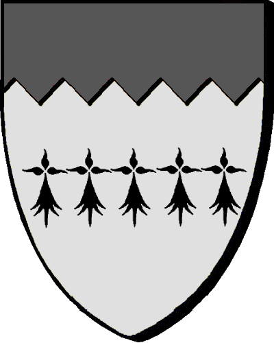 ramage du Faou seigneur dudit lieu, de Kerangouëz et de Kercorentin, en Hanvec "d'argent à cinq hermines de sable, au chef endenché de même" en arc'hant e femp erminig en sabel; e gab dentek ivez en sabel" référencé en 1426 fondu dans Kervennec (dessin selon Pol Potier de Courcy) (PPC)