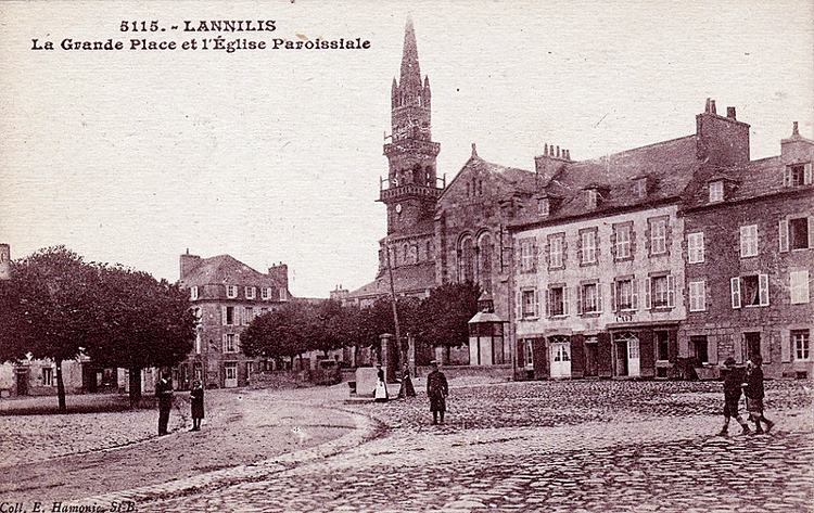 | Histoire / Istor : * Ogée (1780) : Lannilis; gros bourg, sur une hauteur; à 9 lieues à l' O.-S.-O. de Saint-Pol-de-Léon, son évêché; à 47 lieues de Rennes, et à 3 lieues 1/3 de Lesneven , sa subdélégation et son ressort. Cette paroisse relève du roi, et compte 2800 communiants. La cure est présentée par l'évêque. Il se tient à Lannilis six foires par chaque année. Ce territoire, borné au nord, à l'est et au sud par la mer, renferme des terres excellentes et très-bien cultivées. Ses maisons nobles sont : Kerouarts, qui appartenait, en 1360, à Hervé, chevalier, seigneur de Kerouarts; aujourd'hui à la même famille, qui possède encore celle de la Motte; Kercabu appartenait, en 1400, à Guyon-Bellingant, sieur de Kercabu. La seigneurie de Carman*, avec haute, moyenne et basse-justice, qui s'exerce dans la paroisse de Plouguerneau , fut érigée en marquisat au mois d'août 1612, en faveur de Charles de Maillé, seigneur de Carman; c'est une illustre et ancienne maison qui s'est alliée à celles de Rohan, de Luxembourg et autres; elle porte pour devise à ses armes , Dieu avant tout [Doué arauc ou Dieu avant]; elle appartient aujourd'hui à M. de Gontault, duc de Bironc, qui possède encore le Châtel, haute, moyenne et basse-justice. Kerbabu, le Coum [le Com] , Kerangar, Kerovaz [Kerouartz], Kerousien, Mescam, Mescaradec, Rascol, Roualze [la. Roalle], Treffîlis et Trezel. * Marteville et Varin (1843) : LANNILIS (sous l'invocation