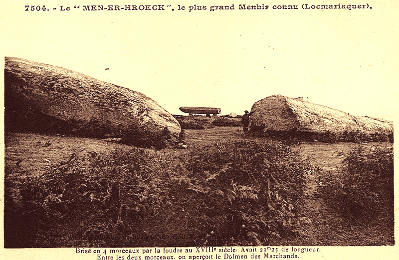 Un peu vers le couchant, on aperçoit renversé et brisé en quatre morceaux le célèbre peulven de Men-er-Groah (la Pierre de la Fée). La tradition rapporte qu'il a été abattu parla foudre. Ce menhir, le plus grand de tous ceux connus, avait 21  m. de hauteur. On estime le poids de cet obélisque monolithe à plus de 200,000  kilog. Il serait facile de le relever en y faisant entrer de forts pitons de fer ou de cuivre, et en le liant ensuite avec des cercles de fer.