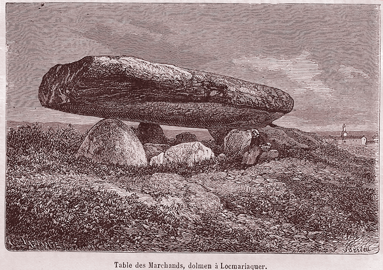 Dans toute l'étendue de la commune, et dans toutes les directions, on trouve des tumulus, des grottes aux fées, des dolmens, des menhirs. Ils couvraient autrefois toute la contrée : brisés et renversés par les passants, ils ont successivement disparu du sol. A Carnac, les monuments druidiques, alignés dans un ordre symétrique, occupent une plus grande étendue de terrain; à Ardeven, ils sont plus nombreux. Mais à Locmariakaër, ils sont plus étonnants et plus gigantesques. Ils prouvent l'importance de cette ville vénète, qui, voisine de Carnac, devait être un des grands centres de la religion des Celtes. Le grand peulven et les principaux dolmens et menhirs ont été apportés de fort loin. Ils sont d'un granit étranger à la localité; le grain en est plus gros et d'une couleur différente.