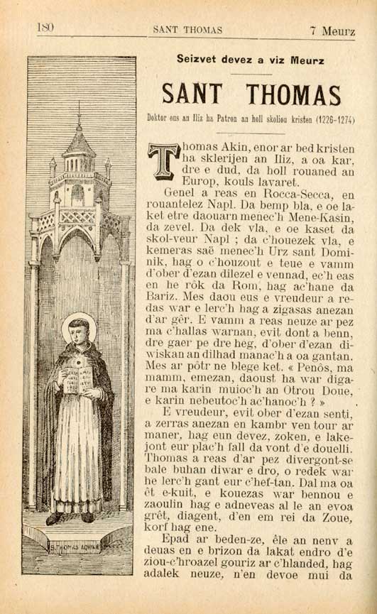 Sant Thomas a oa, daoust da ze, dilorc'husan den a c'helljed kaout. N'en em lake kammed dreist ar re-all; ne lavare kammed eur gomz dismegansus evit eun all; ne vije, kammed, neventi ebet en e gelennadurez, a ziazeze bepred war ar Skritur-Sakr, war lavariou pabed, sent ha doktored an Iliz ha tud fur an amzer goz.