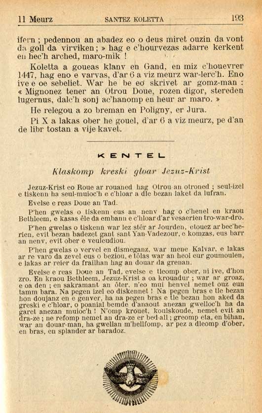 Evelse e reas Doue an Tad, evelse e tleomp ober, ni ive, d'hon zro. En kraou Bethleem, Jezuz-Krist a oa krouadur; war ar groaz, e oa den; en sakramant an ôter, n'eo mui henvel nemet ouz eun tamm bara. Na pegen izel eo diskennet ! Na pegen bras e tle bezan hon doujanz en e genver, ha na pegen bras e tle bezan hon aked da greski e c'hloar, o poanial bemde d'anaout anezan gwelloc'h ha da garet anezan muioc'h ! N'omp krouet, koulskoude, nemet evit an dra-ze; ne refomp nemet an dra-ze er bed-all ; greomp eta, en bihan, war an douar-man, ha gwellan m'hellfomp, ar pez a dleomp d'ober, en bras, en splander ar baradoz.