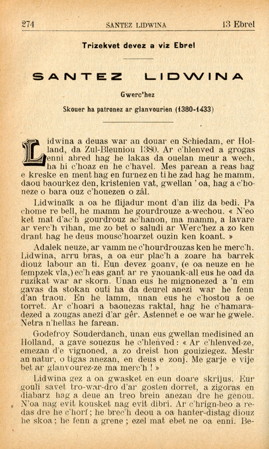 Lidwina gez a oa gwasket en eun doare skrijus. Eur gouli savet tro-war-dro d'ar gosten dorret, a zigoras en diabarz hag a deue an treo brein anezan dre he genou. N'oa nag evit kousket nag evit dibri. Ar c'hrign-beo a redas dre he c'horf; he brec'h deou a oa hanter-distag diouz he skoa; he fenn a grene; ezel mat ebet ne oa enni. Bepred e veze gourvezet war he c'hein, hep flach en tu ebet, kouls lavaret. Eur burzud oa he gwelet o chom beo, hi o kaout kemend-all a boan.