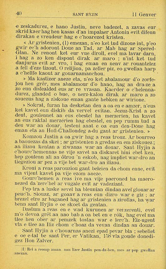 An daou abostol, Per ha Pol o devoa diazezet Iliz Rom en o gwad, tost da gant vla a oa, hag ar brezel eneb ar gristenien a bade bepred. Neuze, eun den brudet bras dre e zeskadurez, e hano Justin, neve badezet, a zavas eur skrid kaer hag hen kasas d'an irnpalaer Antonin evit difenn dirakan e vreudeur hag e c'hoarezed kristen.