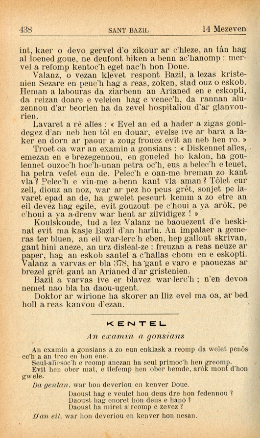 - N'ho peus ket eta, eme Vazil, kavet choaz eun eskob war hoc'h hent, rak anez, en dije komzet d'ec'h evel ma ran. En pep tra, pa n'eneber ket ouz ar wirione hag ouz Doue, ni, eskibien a zo didrous ha da gentan e vezomp o senti ; mes pa ve c'hoant d'hon lakat da nac'h ar gwir greden, neuze an impalaered, n'eus forz pegen galloudus int, kaer o devo gervel d'o zikour ar c'hleze, an tan hag al loened goue, ne deufont biken a benn ac'hanomp : mervel a refomp kentoc'h eget nac'h hon Doue.