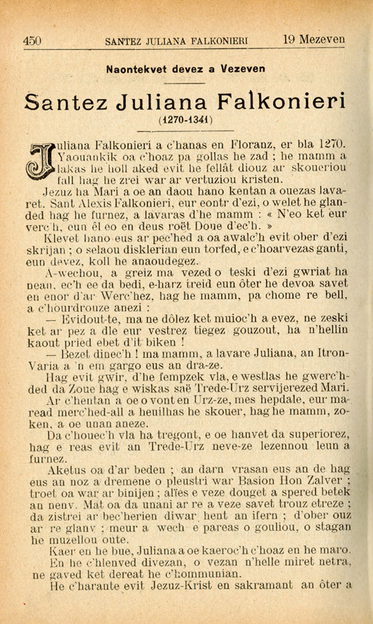 Jezuz ha Mari a oe an daou hano kentan a ouezas lavaret. Sant Alexis Falkonieri, eur eontr d'ezi, o welet he glanded hag he furnez, a lavaras d'he mamm : « N'eo ket eur verc'h, eun êl eo en deus roët Doue d'ec'h. »