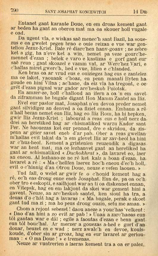 Tud fall, o welet ar gwir fe o c'honid kement hag a rê, ec'h eas droug enne eneb Josaphat. Eun de, pa oa oc'h ober tro e eskopti, e sailhjont war an ti oa diskennet ennan, en Vitepsk, hag en em lakjont da skei war gement hini a gavent. Neuze, an arc'heskob santel, ken sioul ha tra, a deuas d'o c'hât hag a lavaras : « Ma bugale, perak e skoet gant tud ma zi; ma ho peus droug ouzin, setu me aman. »