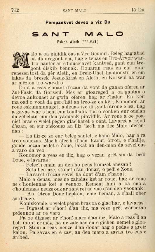 - En iliz-ze zo eur beleg santel, e hano Malo, hag a ra treo souezus. Mac'h afec'h d'hen kaout, ôtrou, e c'hallje, goude bezan pedet e Zoue, lakat an den-man da zevel eus a varo da veo !