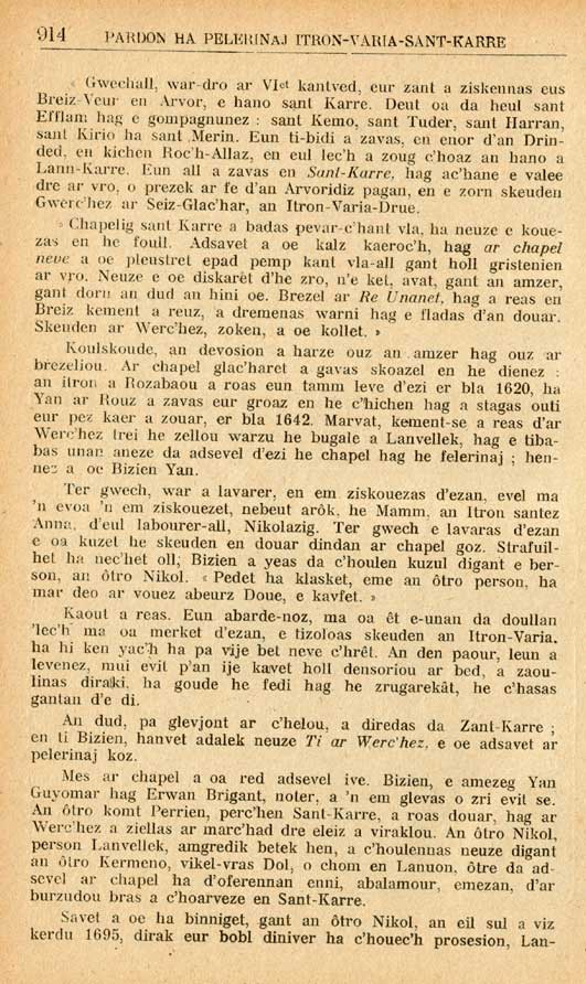 » Chapelig sant Karre a badas pevar-c'hant vla, ha neuze e kouezas en he foull. Adsavet a oe kalz kaeroc'h, hag ar chapel neve a oe pleustret epad pemp kant vla-all gant holl gristenien ar vro. Neuze e oe diskaret d'he zro, n'e ket, avat, gant an amzer, gant dorn au dud an hini oe. Brezel ar Re Unanet, hag a reas en Breiz kement a reuz, a dremenas warni hag e fladas d'an douar. Skeuden ar Werc'hez, zoken, a oe kollet. »
