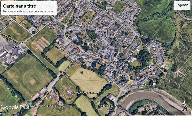 Définition / Displegadur : Station romaine Isca Silurum, aujourd'hui Caerleon / Caerleon ar Wysg, sur la rivière Usk, comté de Monmouth, en Pays de Galles.