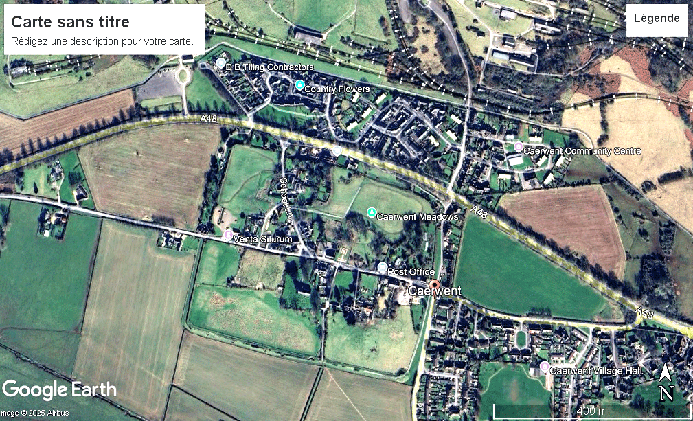 Photographie satellitaire Google Earth, 2025, où l'on devine parfaitement le carré de délimitation fortifiée de Venta Silurum |