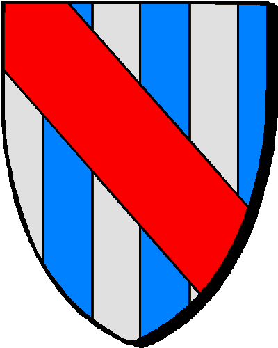 et traduction bretonne par J.-C. Even BOTHEREL, (ramage des comtes de Rennes); vicomte d'Appigné en 1585, par. du Rheu. Réf. de 1427 é 1513, dite pan, évêché. de Rennes. D’argent à dix ancolies d’azur, soutenues de gueules, les tiges en haut 3. 2. 3. 2 En arc'hant e zek merveskenn en glazur, garennet en gwad, garennoù ouzh kab, 3, 2, 3, 2 allias / neuz all : - un lion accompagné de trois ancolies (couleurs non précisées) - ul leon heuliet gant teir merveskenn (livioù disanvet) - Geoffroy et Alain fils Aymeric, témoins dans une donation au prieuré de Combourg en 1080; - Regnault, sénéchal de Rennes, témoin de la charte de Conan IV en faveur des hospitaliers de Saint-Jean en 1160; - Pierre, ratifie le traité de Guérande en 1381. Fondu au XVIIè siècle dans le Sénéchal de Carcado. |
