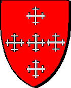 Famille Huon : "de gueules, à cinq croisettes recroisettées d'argent en croix / en gwad, e bemp kroaz kroaziganek en arc'hant en kroaz"