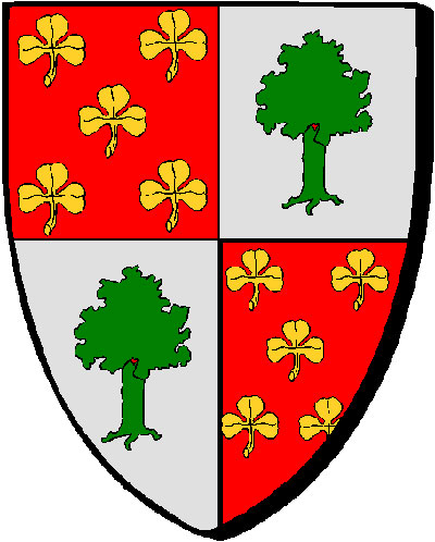 Famille de Keroul : "d'or, à trois chênes de gueules / en aour, e deir dervenn en gwad" |