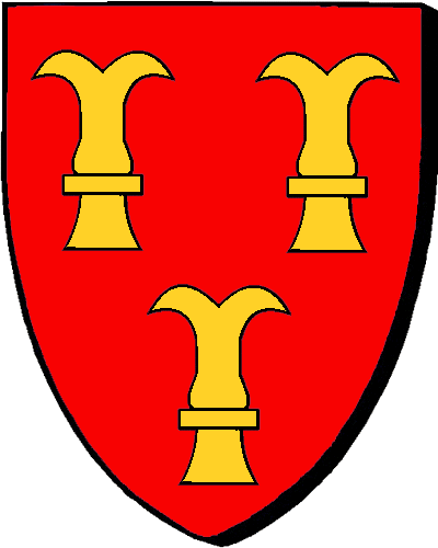Originaire du Poitou. Seigneuries non indiquées. "d'argent au chevron de sable, accompagné en chef de deux merlettes de même et en pointe d'un d'un croissant de gueules" "en arc'hant e gebrenn e sabel, heuliet ouzh kab gant div voualc'henn ivez en sabel, hag ouzh ben gant ur greskenn en gwad" - Gautier, juge et lieutenant général de la sénéchaussée de Châtelleraut, conseiller au Parlement de Bretagne en 1554 (décédé en 1558). Armorial 1696. (PPC) |