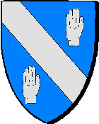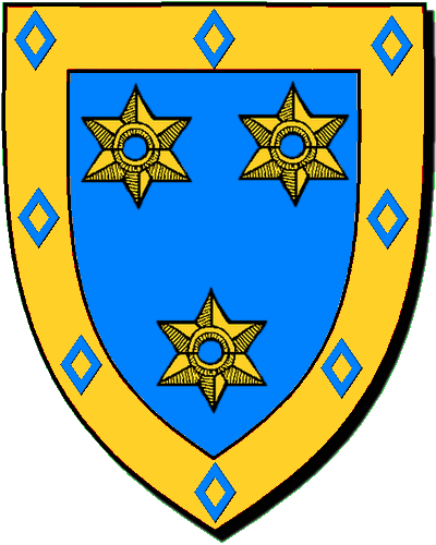 "d'azur au chevron d'or, accompagné de trois roses de même" "en glazur e gebrenn en aour heuliet gant teir rozenn ivez en aour" alias / neuz all : "d'argent à la fasce d'or, chargée de trois lionceaux de sable" "en arc'hant e dreustell en aour karget gant tri leonig en sabel" - Jean, conseiller au Parlement de Bretagne en 1577, épouse : 1° en 1584, Françoise de la Bintinaye; 2° Marguerite Ferron. |